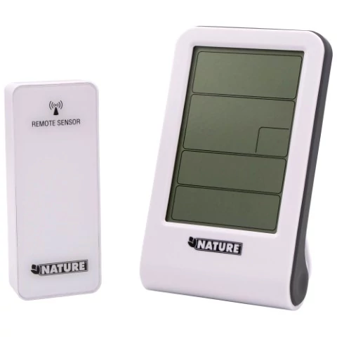 A Nature 6080114 DIGI 3 meteorológiai állomás fejlettebb kijelzőfelülettel és részletesebb visszajelzésekkel támogatja a beltéri–kültéri klíma figyelését. A nagy, jól látható képernyőn egyszerre jelenik meg a belső és külső hőmérséklet, a páratartalom, valamint az időjárási ikonok, amelyek jelzik a várható tendenciát. Minimum–maximum funkciót is tartalmaz, így visszakövethető a napi hőmérsékleti változás. Az óra, dátum és ébresztés funkció tovább növeli praktikumát. A vezeték nélküli kültéri érzékelő stabil kommunikációt biztosít, a készülék pedig falra rögzíthető vagy asztalra helyezhető. Egyszerűen kezelhető, energiakímélő működésű és modern megjelenésű, ezért lakásokban, irodákban, télikertekben vagy üvegházakban is jól használható. A Nature 6080114 modell ideális választás, ha részletesebb időjárási és beltéri klímainformációkat szeretnél egyetlen könnyen leolvasható kijelzőn.